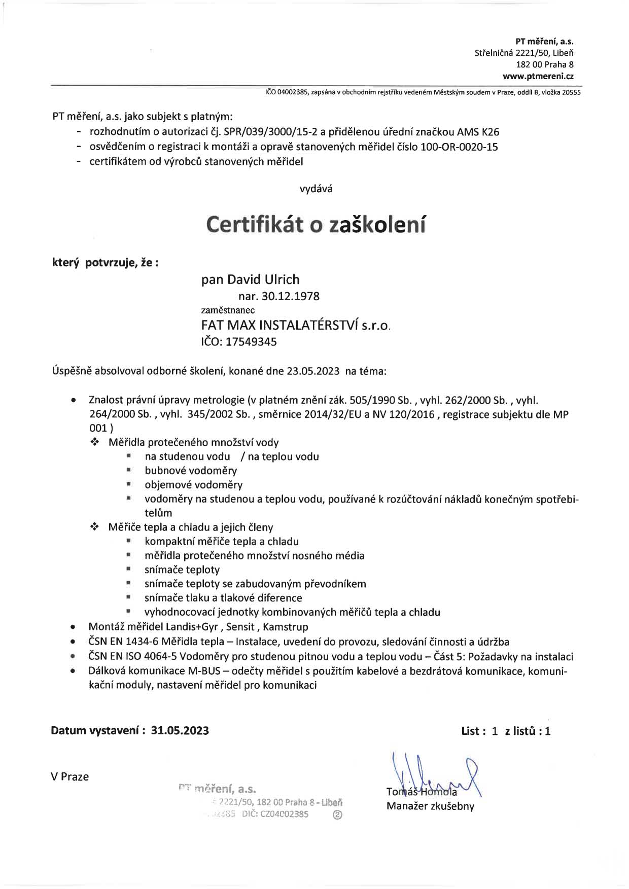 Certifikát pro měření a montáž měřících zařízení